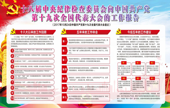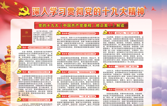 本次“学习宣传贯彻党的十九大精神”主题宣传展板共6块,以党的十九大报告为主线,从多个角度展现十九大精神的丰富内涵。展板包括党的十九大报告解读,以关键词的形式从大会主题、极不平凡的五年、中国特色社会主义进入了新时代、我国社会主要矛盾、新时代中国共产党的历史使命、新时代中国特色社会主义思想八个“明确”、新时代坚持和发展中国特色社会主义的基本方略、新时代党的建设总要求等18个方面对报告进行解读;包括第十九届中共中央组织结构图、党的十九大《中国共产党章程(修正案)》解读、习近平新时代中国特色社会主义思想解读和十八届中央纪委向党的十九大的工作报告解读。展板图文并茂,既有一定的理论深度,又有直观、生动的特点,达到了内容和形式的统一,受到公司干部职工的一致好评。