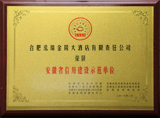 2018年3月23日,由省社科院、省经信委、省政府法制办、省政府金融办、省信用协会和省信用研究中心联合举办的《2017信用蓝皮书-安徽信用发展报告》发布暨信用安徽高峰论坛活动在合肥召开,合肥泓瑞金陵大酒店有限责任公司荣获“安徽省信用建设示范单位”称号。
