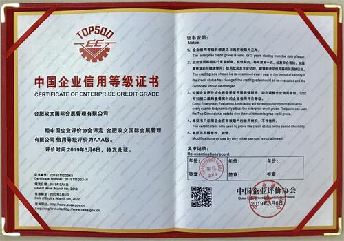 中国企业评价协会是国务院发展研究中心于1991年发起成立,是民政部注册、唯一具备企业评价资质的国家级社团法人组织。中国企业评价协会严格按照相关规定,对企业进行全方位、高要求的考量,综合评估了信用制度建设、从业守信、从业业绩、社会责任等各方面因素,充分展示出3A级别的含金量。而3A作为最高等级,反映了政文会展公司具有优秀的信用记录,良好的经营状况,稳定的运营能力,以及积极的发展前景。
