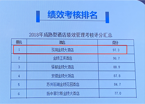 2019年4月10日,“争一流,夯实基础;强拓展,扩大规模”金陵连锁酒店总经理主题年会在四川成都召开。合肥泓瑞金陵大酒店在2018年成熟型酒店绩效管理考核评分中得分97.3分荣获第一名。