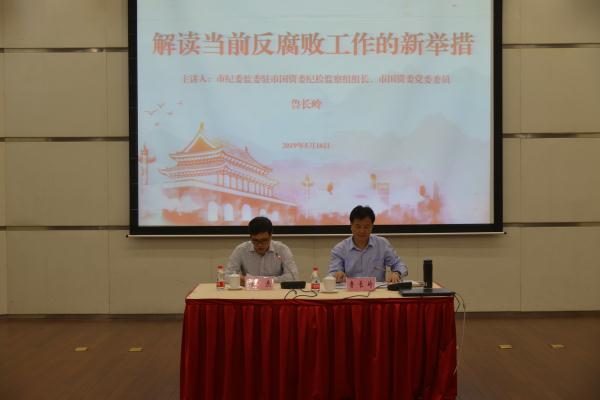 会议第二阶段,开展廉政讲座,由公司党委书记、董事长陈杰同志主持。邀请市纪委监委驻市国资委纪检监察组组长、市国资委党委委员鲁长岭同志作“解读当前反腐败工作的新举措”的专题讲座。鲁长岭同志在讲座中,重点解读了当前纪委监委体制机制改革情况,重点介绍了我市纪委监委查办市属国有企业腐败案件情况,重点分析了当前反腐败工作的新举措。整场讲座有观点有解读,有论述有案例,既寓意深刻又深入浅出,对全面提高公司党员干部素质,提升廉洁自律意识,增强拒腐防变能力,具有很强的警示效果和指导意义。