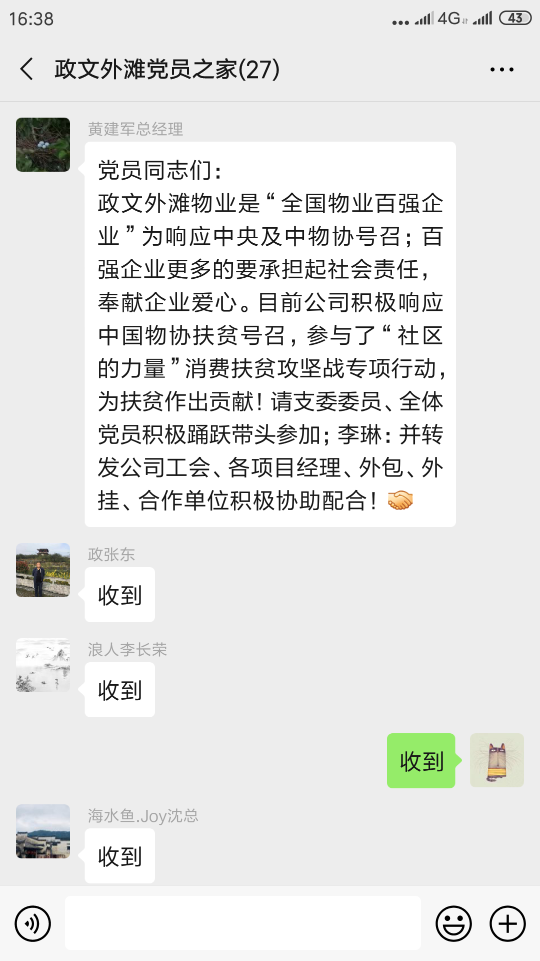 为积极响应中国物业管理协会开展的“社区的力量”消费扶贫专项行动,政文外滩物业召开“党建引领 扶贫助农 助力脱贫攻坚战”动员大会。号召公司全体党员、职工、服务社区居民积极参与“社区的力量”消费扶贫活动中,充分发挥党建引领举旗定向作用,齐心协力扶贫助农,决胜全面建成小康社会。