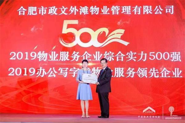 合肥市政文外滩物业管理有限公司凭借良好的经营情况、管理规模、盈利能力及其他综合指标要素荣获“2019物业服务企业综合实力500强”“2019办公写字楼物业服务领先企业”。