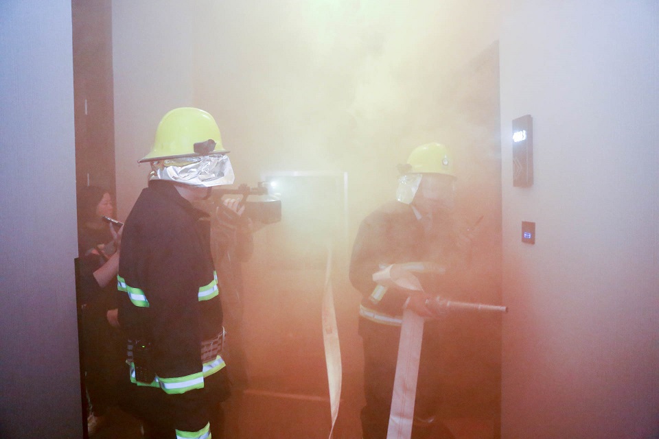 3.酒店各部义务消防队员配合现场模拟演练灭火场景