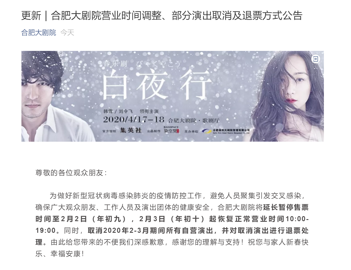 启动应急预案,原定2月4日举行的市两会延期举行,2-3月演出全部取消,暂停租场活动预定。对剧院所有公共区域、办公场所进行预防性清洁消毒。严格人员、车辆进出管理,非公司员工一律禁止进入剧院。随时掌握员工情况,统计所有春节期间外出员工情况及往返时间,要求员工做好防护工作。