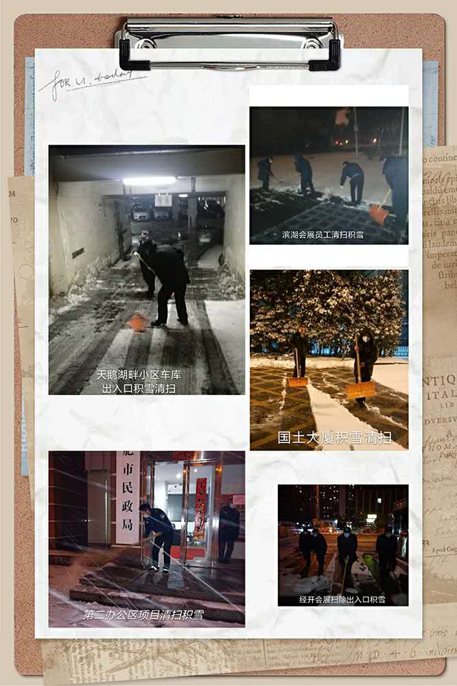 2月15日,合肥狂风肆虐,霸都迎来2020年的第一场大雪,政文外滩物业各个管理项目抗疫战线上的党员干部、一线职工坚守在工作岗位上,迎战风雪,抗击疫情。