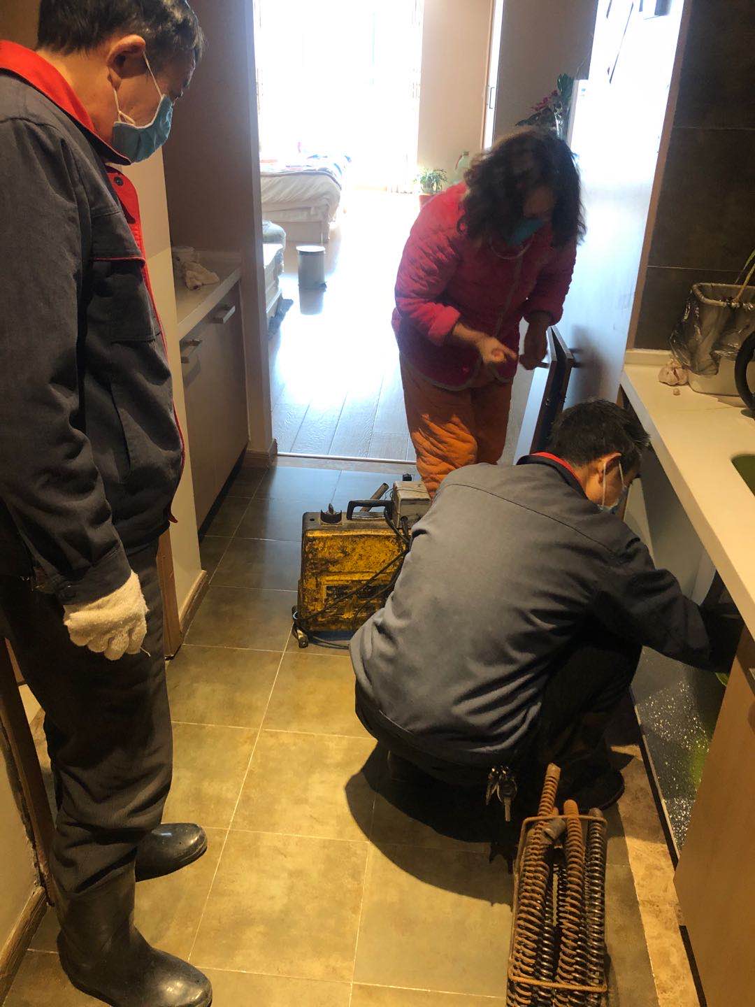 为了解决业主问题,客服员第一时间联系专业疏通管道的人员,但因疫情园区封闭,管道疏通人员无法过来。在全民抗击疫情期间,保障业主正常生活是政文外滩物业的使命,项目部立即安排两名维修工上门维修,疏通。