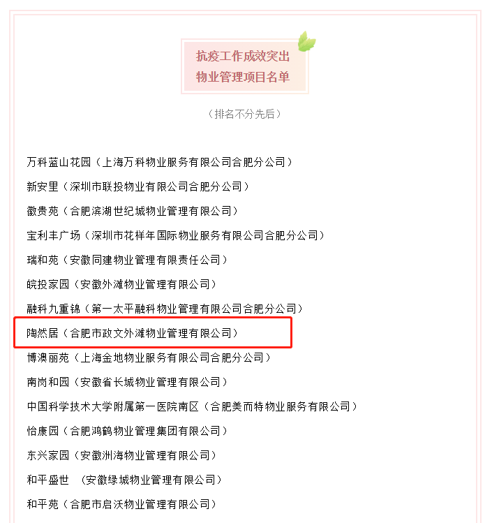 6月24日,“合肥市深化党建引领、全面提升物业工作水平”大会在合肥梅山饭店隆重召开。会议对合肥市物业行业党建工作及疫情防控等工作进行了总结和部署,并对抗疫工作成效突出的党支部、物业企业、物业管理项目、物业工作者等进行通报与表彰。公司管理的陶然居小区荣获“抗疫工作成效突出物业管理项目”称号。