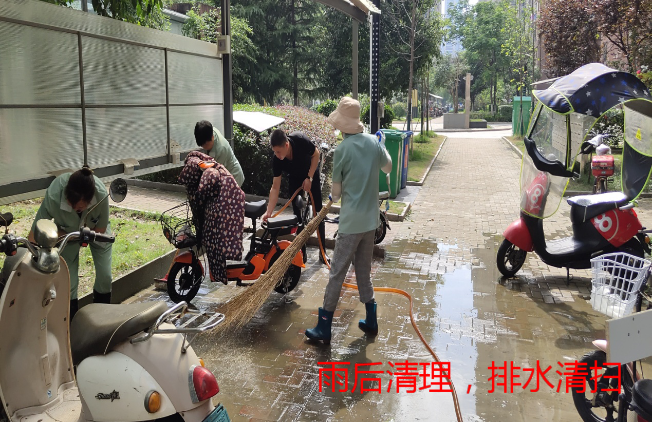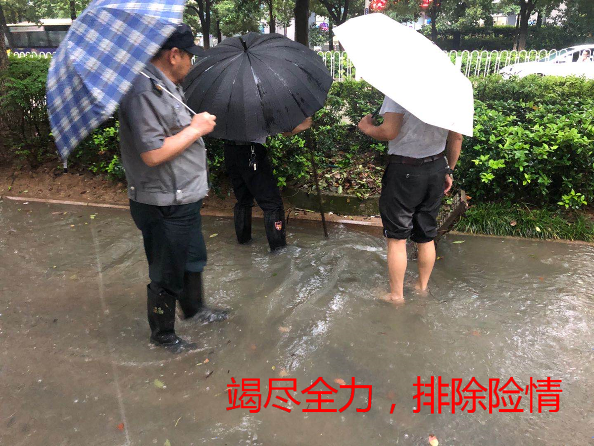 在暴雨肆虐之时,尽管我们有着最严密的防护措施,但为了保险起见,政文外滩物业的守护者对在管项目车库所有自动集水井进行了再一次状况排查,检查是否正常运行、是否积水,确保设施设备正常运转。由于雨天导致落叶、污泥较多,清洁工作量大,物业人及时增派人手,对车库地面进行拖洗,同时全面开启车库抽排风系统,加快车库内积水蒸发和消散。