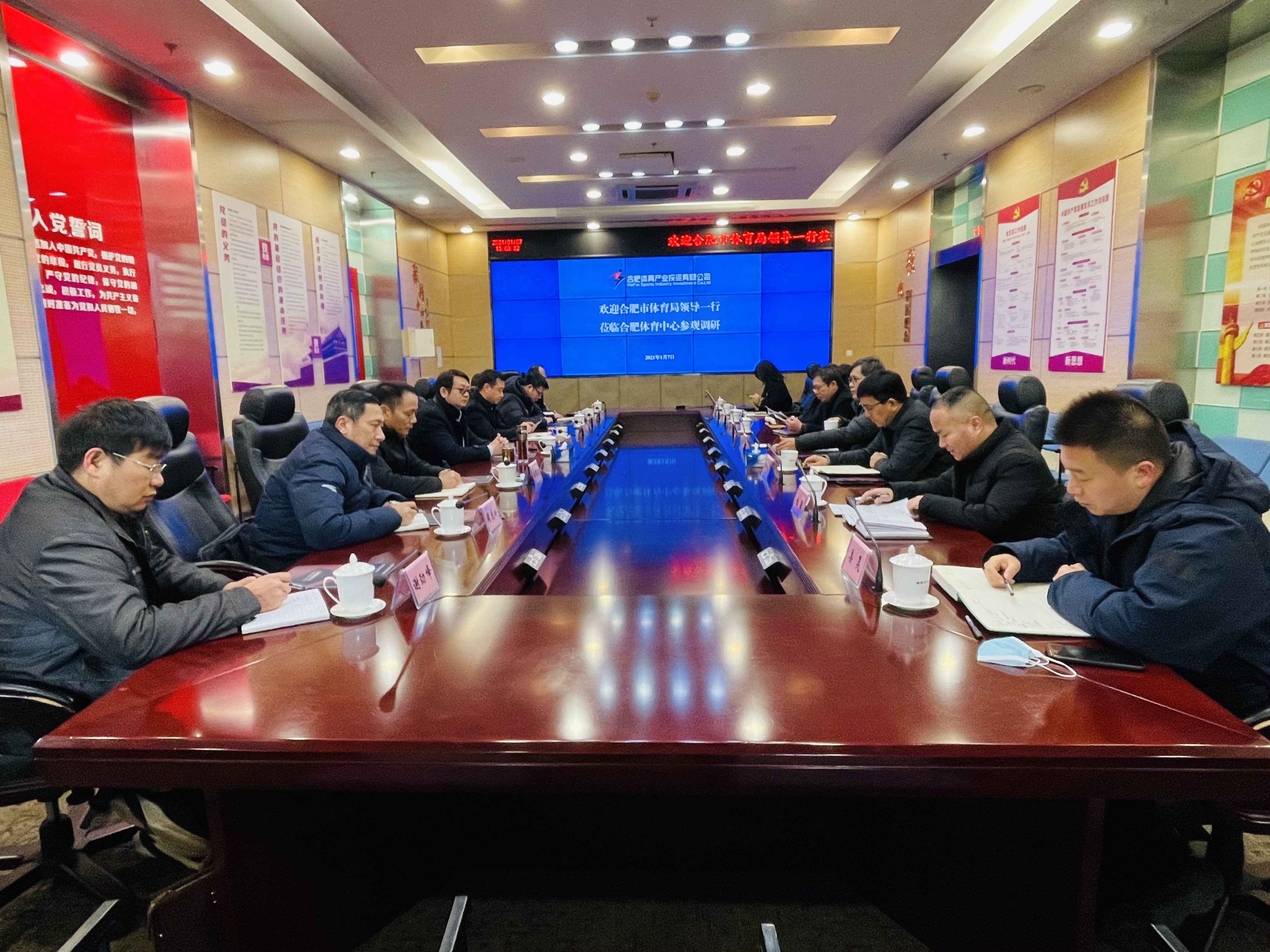 1月7日,市体育局局长菅青,副局长陆志勇、孙根友等一行莅临合肥体育中心参观调研,集团公司党委书记、董事长陈杰,党委委员、董事、副总经理杨兴武等陪同。