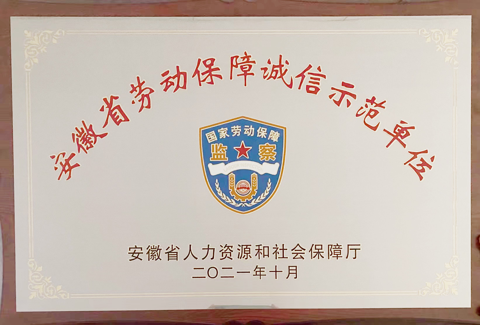 在2021年度安徽省人社局组织开展的企业劳动保障守法诚信等级评价活动中,合肥市政文外滩物业管理有限公司荣获“安徽省劳动保障诚信示范单位”称号。此项荣誉既是对政文外滩物业规范劳动用工和劳动保障管理工作的肯定,也是对公司今后工作的鼓励和鞭策。