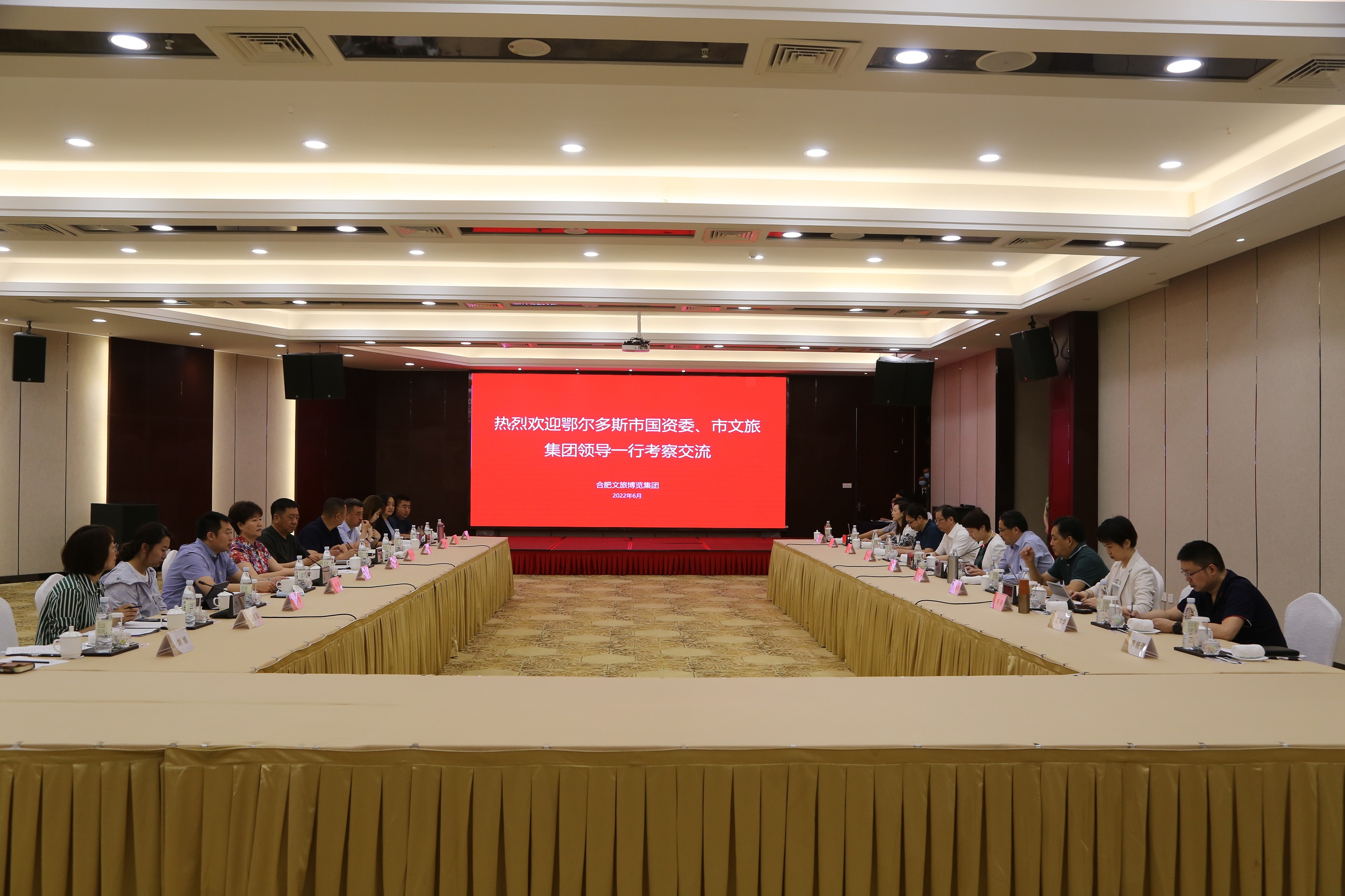 6月 11日,在集团总经济师张大顷陪同下,调研组一行实地考察了庐江云里安凹、六家畈、合肥滨湖湿地公园等我市文旅项目,鄂尔多斯客人对我市近年来大力发展文旅产业的好做法高度认可,对全市文旅产业发展取得成绩表示赞赏。为进一步深化合作交流,12日上午,双方在泓瑞金陵大酒店召开座谈会。座谈会上,尹传桂总经理对鄂尔多斯市国资委、市文旅集团一行的来访表示热烈欢迎,并介绍了集团的发展运营情况。近年来,集团紧紧围绕改革三年行动方案和国有资本运营公司试点方案,以党建为引领,以改革为动能,以市场为导向,以资本为纽带,以整合为手段,以创新为路径,以发展为目标,逐步形成以“旅游、会展产业”为主导,“文化、体育产业”为重点,“酒店、物业”为支撑,“教育、康养”融合发展的产业发展格局。随后,会展和酒店主要负责人就酒店板块、会展板块运营情况进行分享。