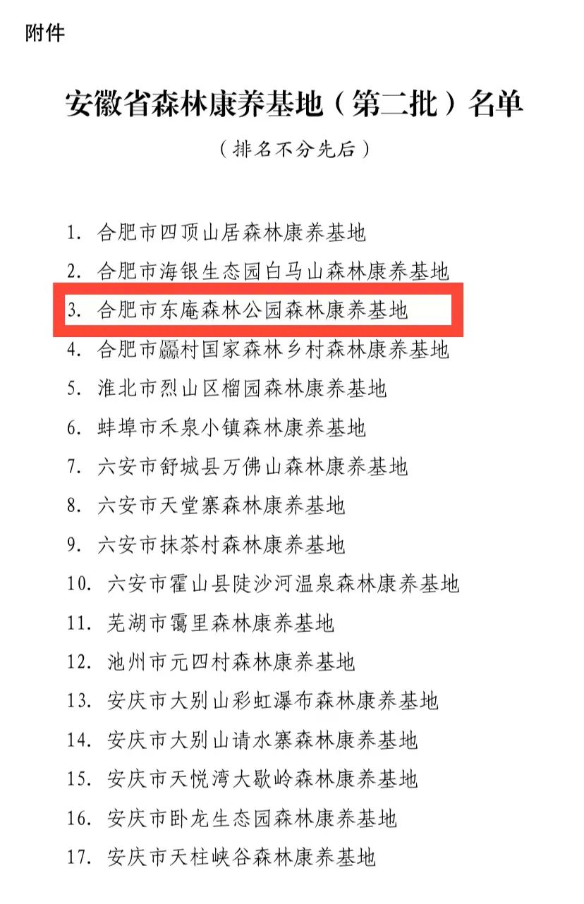 近日,安徽省林业局、安徽省民政厅、安徽省卫生健康委员会、安徽省体育局和安徽省中医药管理局公布安徽省森林康养基地(第二批)名单,巢湖东庵森林公园获此称号!