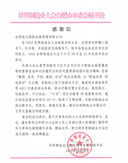 近日,合肥政文国际会展管理有限公司收到世界制造业大会合肥市承委会秘书处感谢信,信中对政文会展支持和保障“2022世界制造业大会”表示衷心感谢!