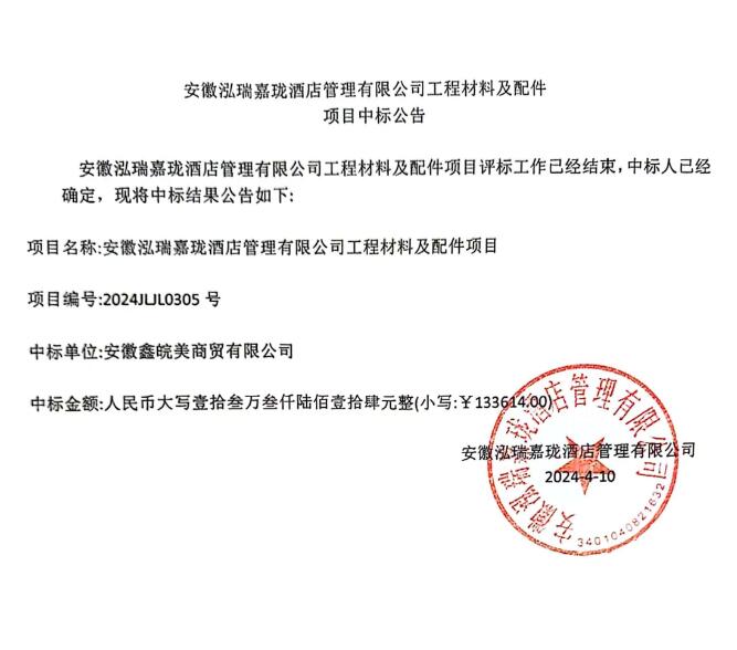 安徽泓瑞嘉珑酒店管理有限公司工程材料及配件项目中标公告