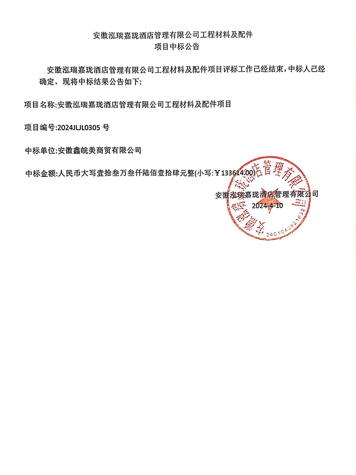 安徽泓瑞嘉珑酒店管理有限公司工程材料及配件项目中标公告