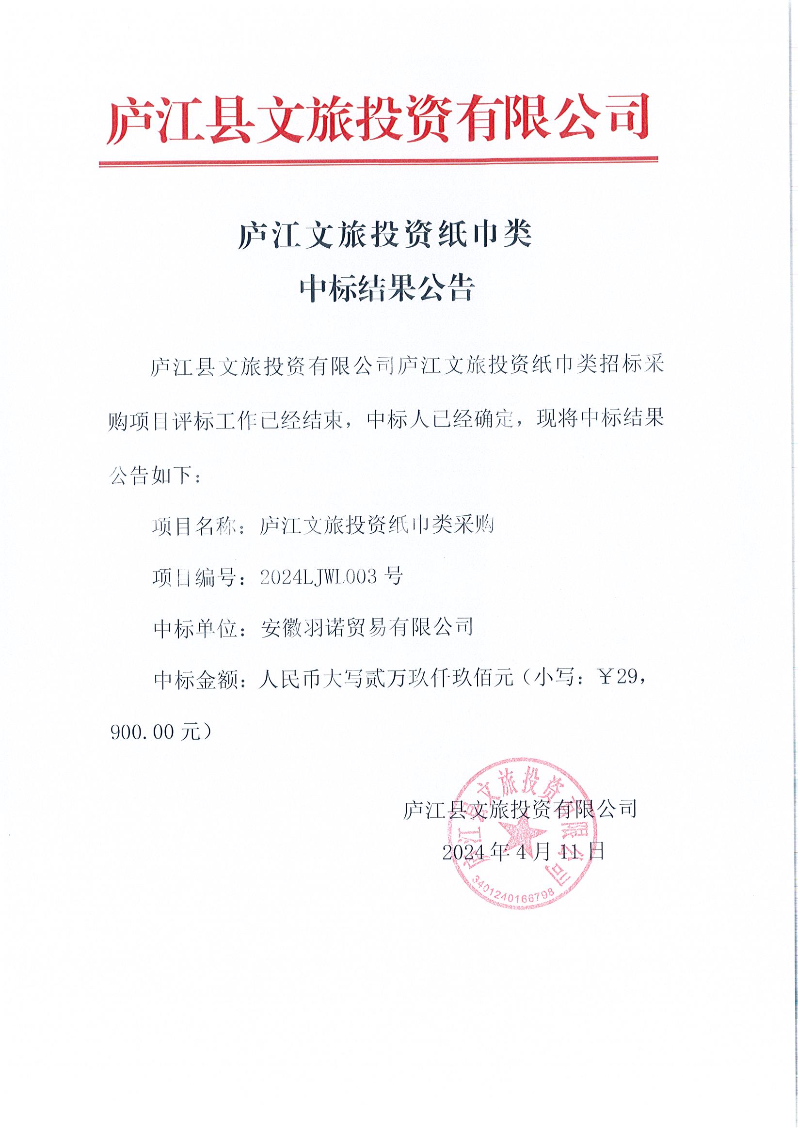 庐江文旅投资纸巾类中标结果公告