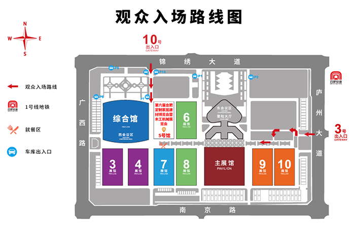 1. 普通观众请由上图所示锦绣大道10号道口、庐州大道3号道口进出参观。