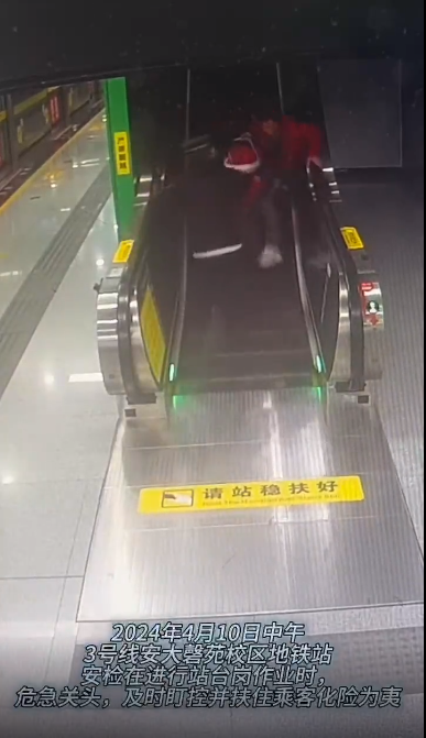 4月10日12点左右,安大磬苑站一位乘客在上行扶梯上差点摔倒,危急时刻,登安公司安大磬苑校区站站台岗张伟俊飞奔而上,避免了一次意外发生。