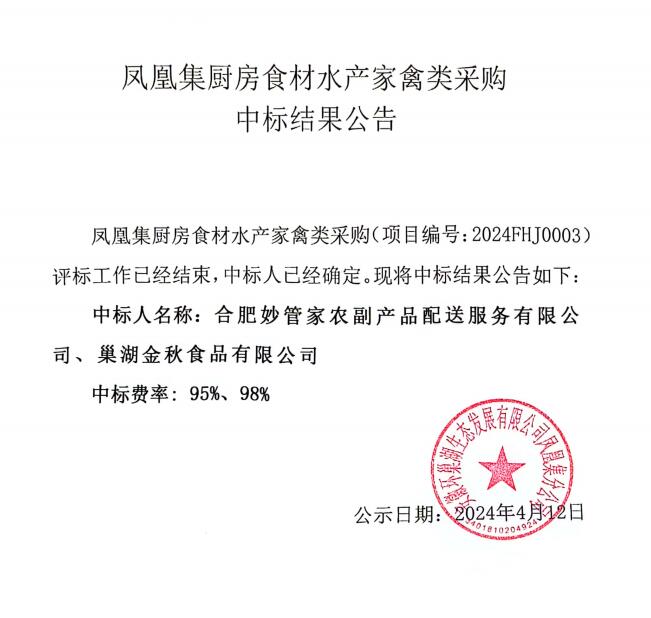 凤凰集厨房食材水产家禽类采购中标结果公告
