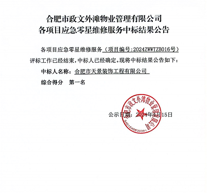 合肥市政文外滩物业管理有限公司各项目应急零星维修服务中标结果公告