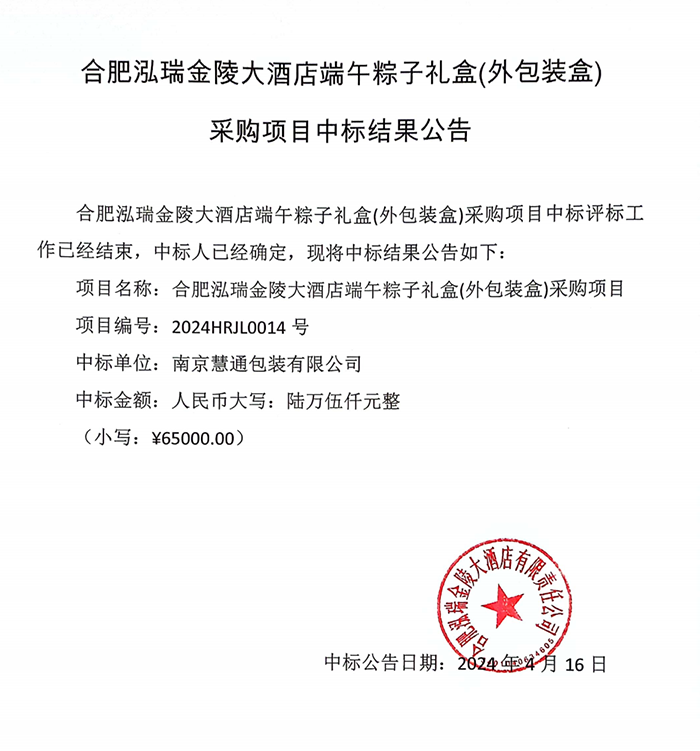 合肥泓瑞金陵大酒店端午粽子礼盒(外包装盒)采购项目中标结果公告