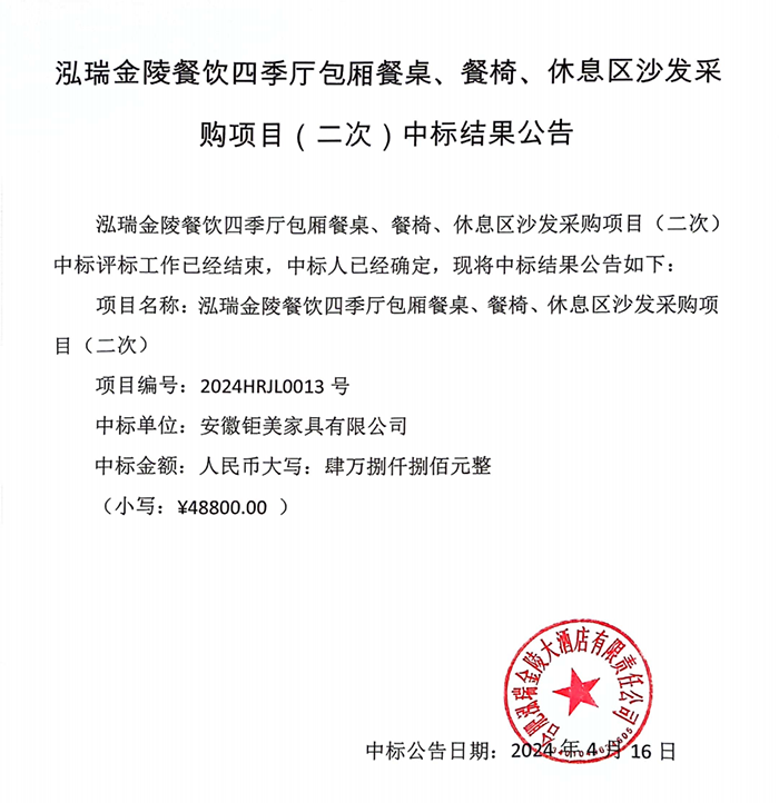 泓瑞金陵餐饮四季厅包厢餐桌、餐椅、休息区沙发采购项目(二次)中标结果公告