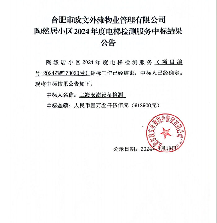 合肥市政文外滩物业管理有限公司陶然居小区2024年度电梯检测服务中标结果公告