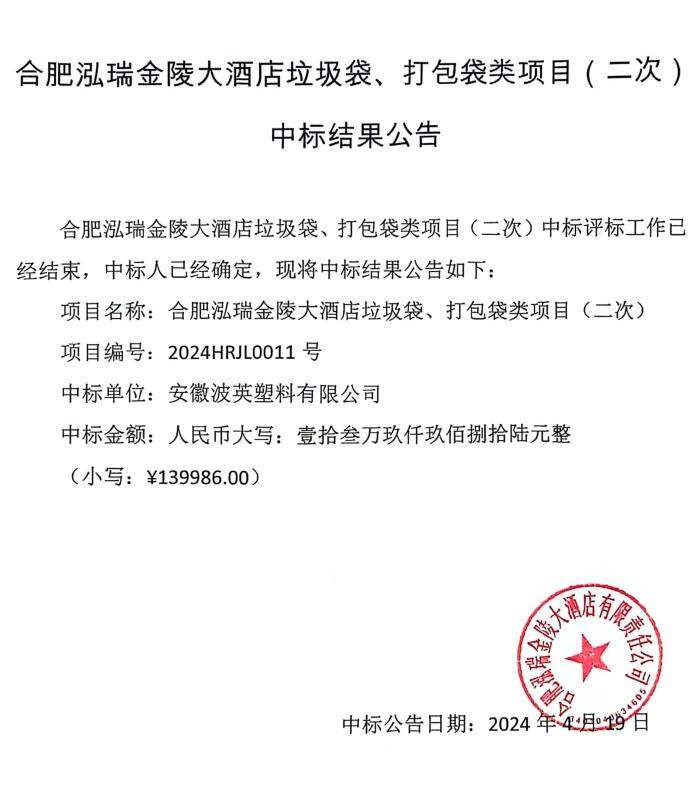 合肥泓瑞金陵大酒店垃圾袋、打包袋类项目(二次) 中标结果公告