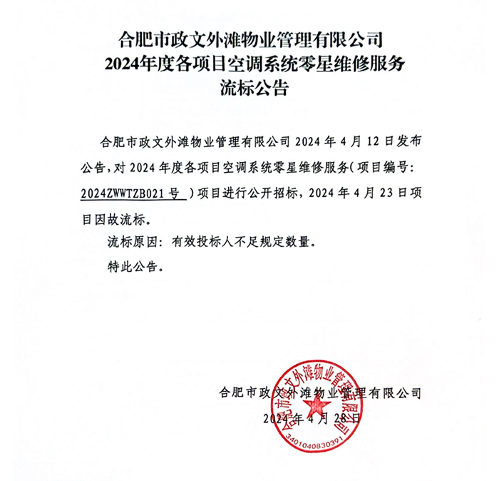 合肥市政文外滩物业管理有限公司2024年度各项目空调系统零星维修服务流标公告