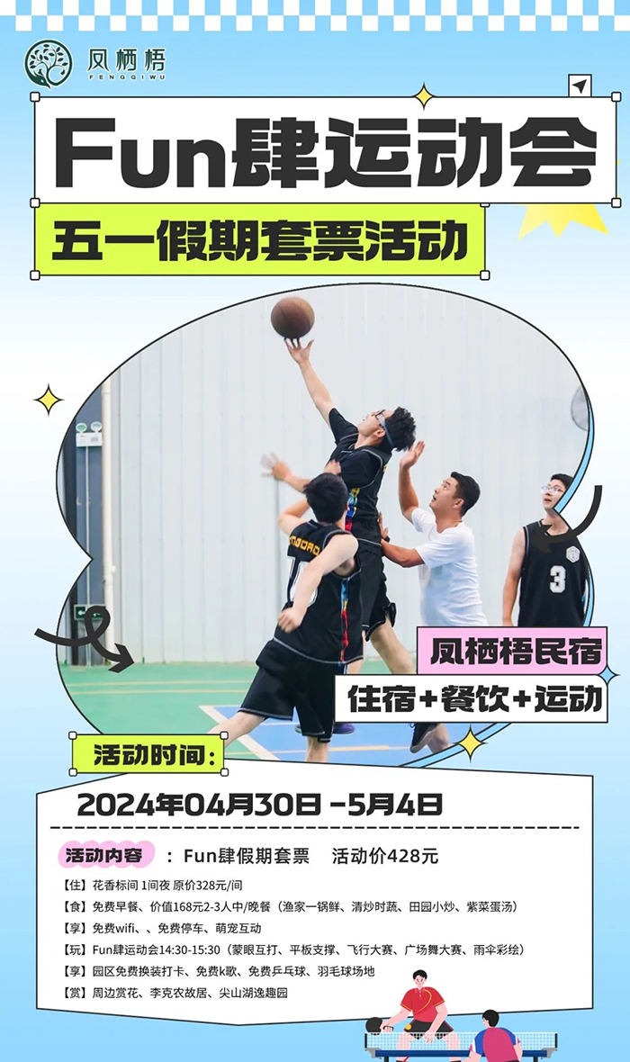 凤栖梧民宿还特别举办“FUN肆运动会” ,邀请您来一场酣畅淋漓的运动体验。让我们一起相约凤栖梧,放空身心,感受自然享受运动的激情吧!