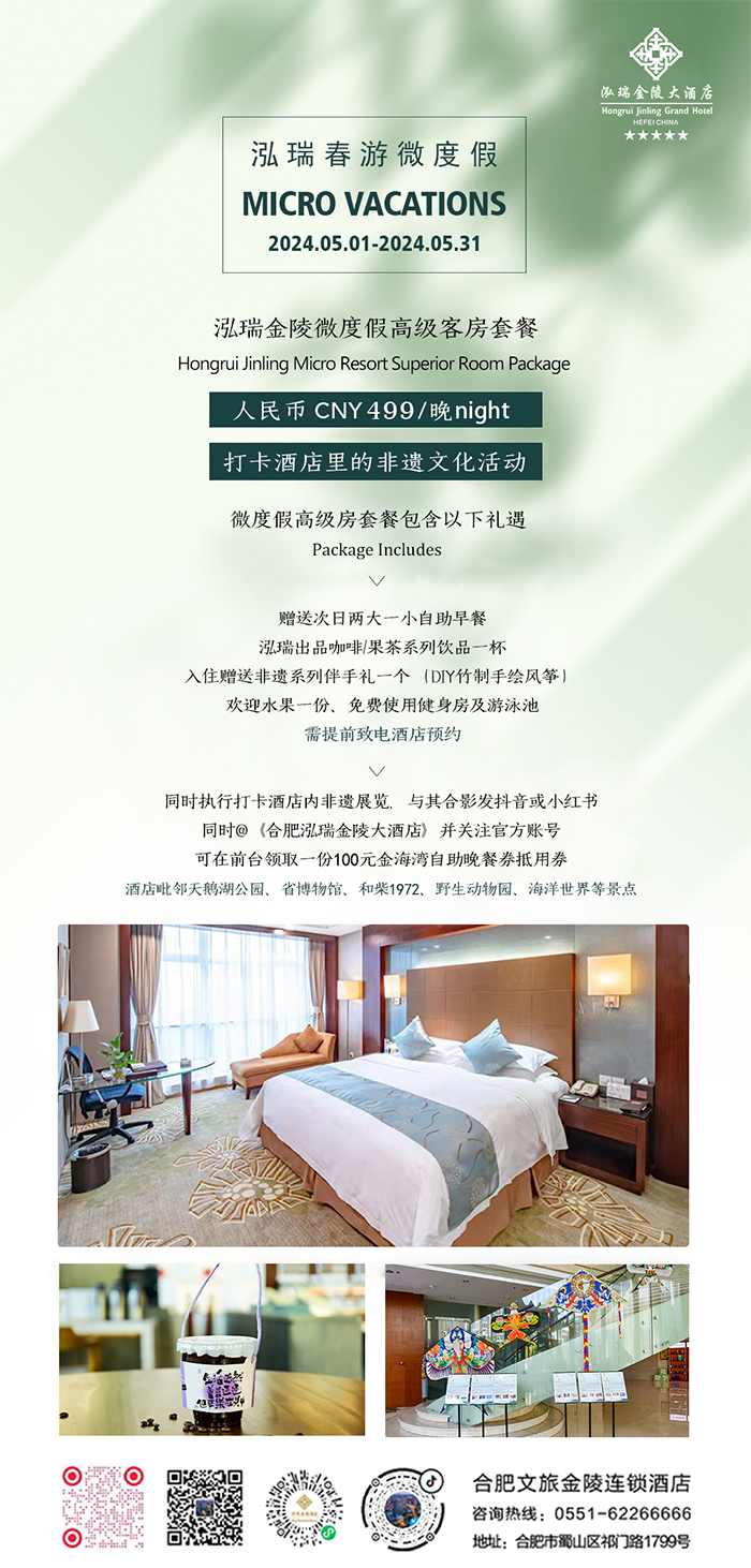 5月1日-5月5日期间入住,连住三晚折上9折优惠;所有房型+38元获赠(法香沁心系列)洗护旅行套/份;入住套房、家庭房、嘉宾双房型可获得一份价值40元合肥特色四大名点随机一盒。入住家庭房的小朋友还可获得一份可爱糖画。