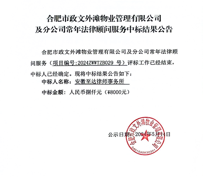 合肥市政文外滩物业管理有限公司及分公司常年法律顾问服务中标结果公告