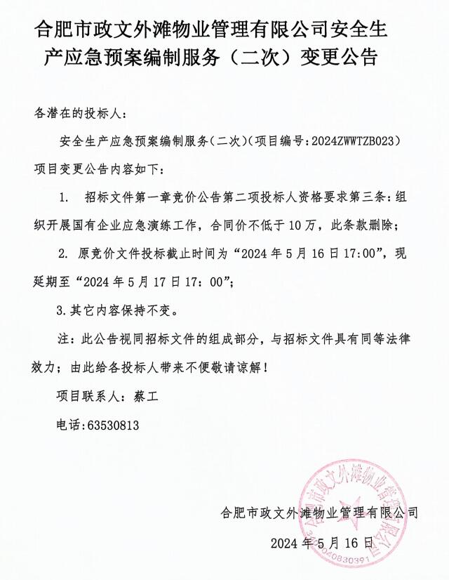 合肥市政文外滩物业管理有限公司安全生产应急预案编制服务(二次)变更公告