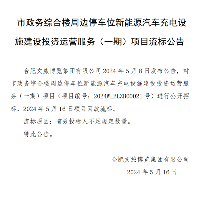 市政务综合楼周边停车位新能源汽车充电设施建设投资运营服务(一期)项目流标公告