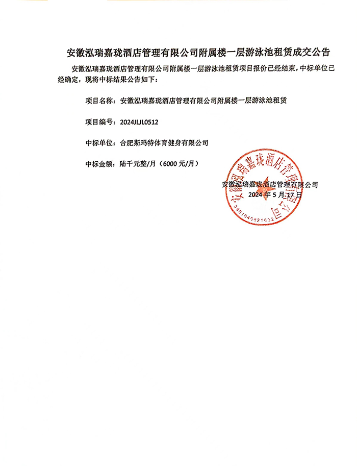 安徽泓瑞嘉珑酒店管理有限公司附属楼一层游泳池租赁成交公告