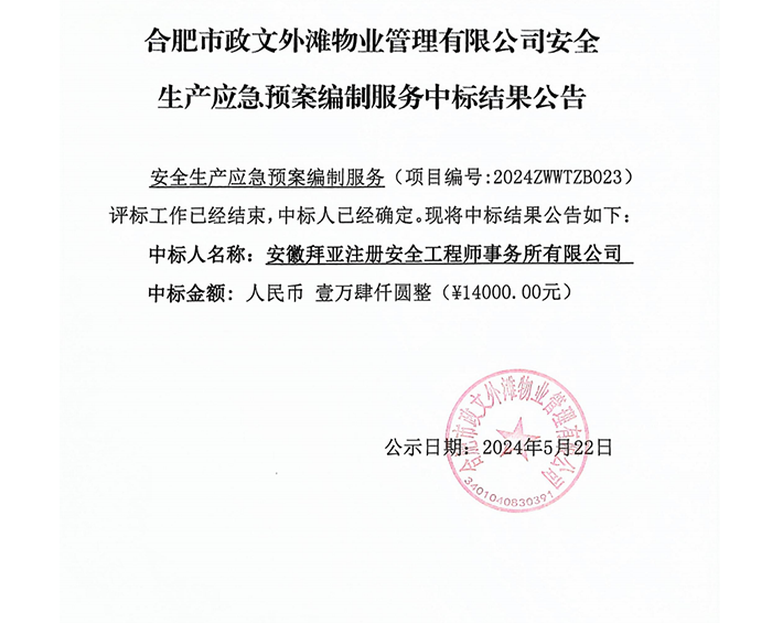 合肥市政文外滩物业管理有限公司安全生产应急预案编制服务中标结果公告