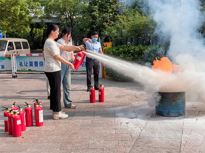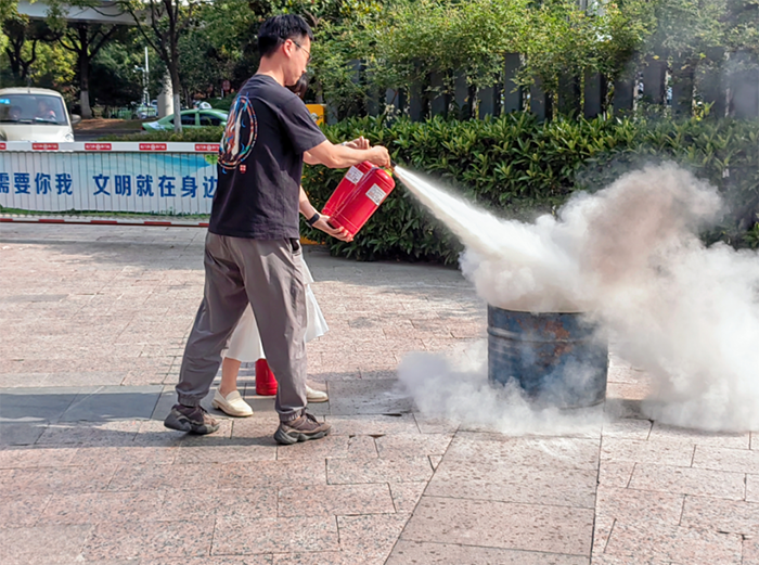 随后,在消防专家的指导下,大家按照刚学的灭火器“一提、二拔、三握、四压”的规范操作,对准火苗根部进行灭火演练。整个演练过程紧张有序,充分展现了员工们的应急反应能力和团队协作精神。