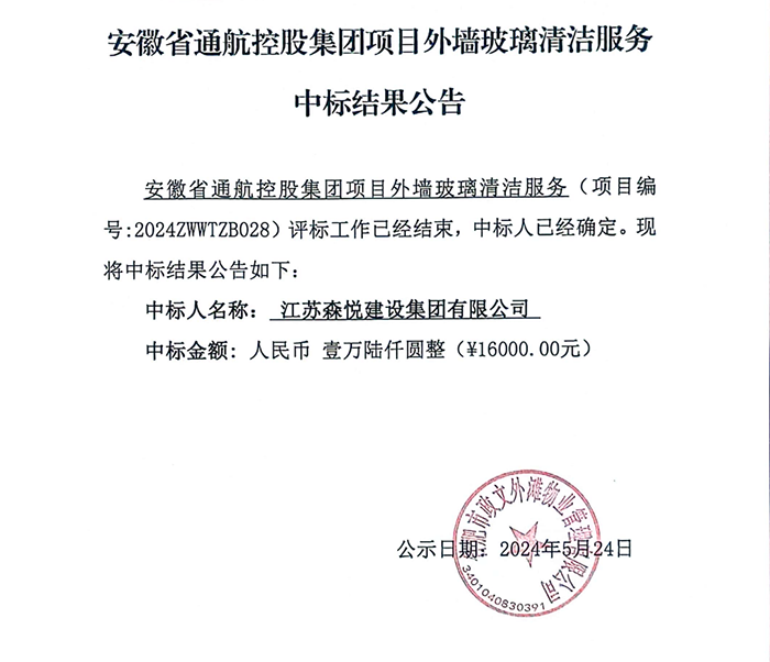 安徽省通航控股集团项目外墙玻璃清洁服务中标结果公告