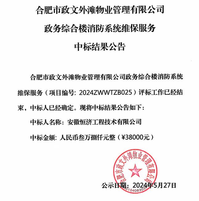 合肥市政文外滩物业管理有限公司政务综合楼消防系统维保服务中标结果公告