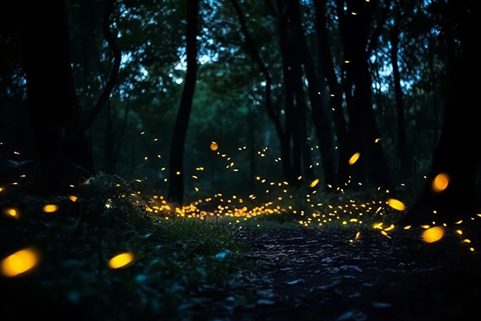 晚风吹拂,踏进静谧的森林,惊起星星点点的萤火之光,展现出独属夏夜的宁静和美妙。晴电忽穿树,相识有流萤,萤火虫一闪一闪似繁星,点亮夜空,夏夜最美丽的风景,莫过于此了。