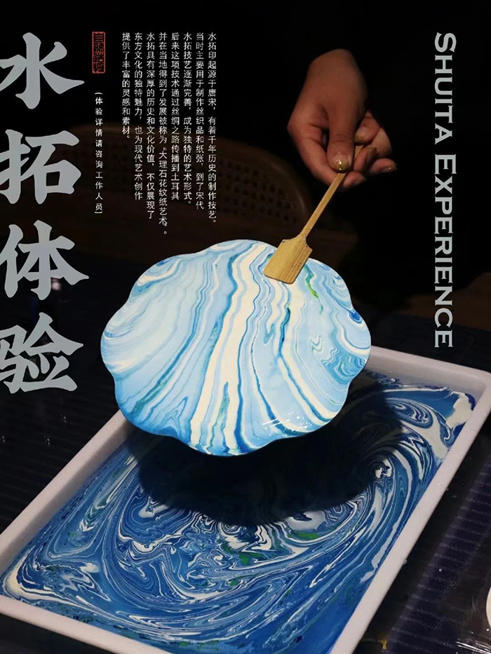 以扇为纸,以水作画,自然造物,水拓画起源于唐宋的墨池画,是我国水墨画众多画法其中的一种画,每一次浸泡邂逅独一无二的花纹。