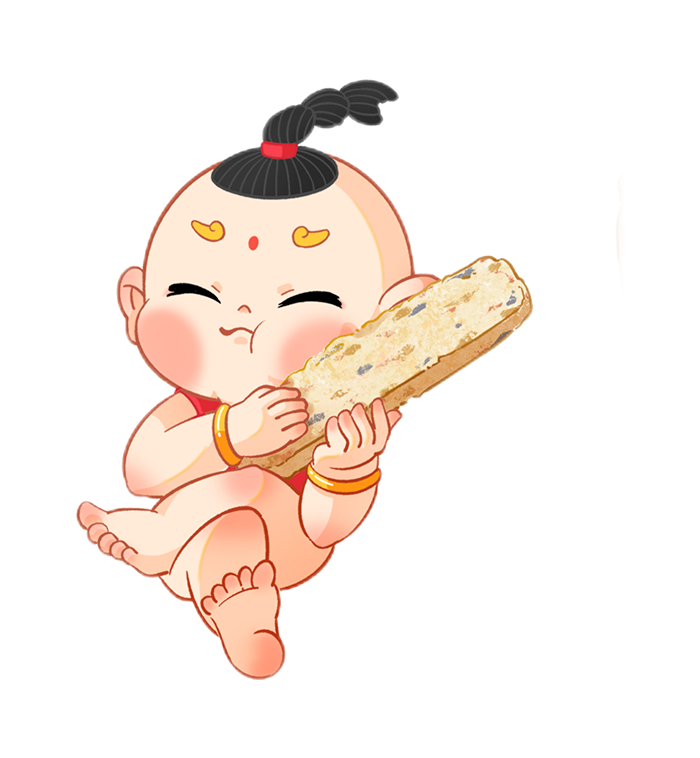 我是二娃,是跟着大娃姐姐的小跟班,我手上拿着的是咱们合肥的新四大名点-寸金,它可是给我提供能量的能量棒哦,我可爱吃了呢。