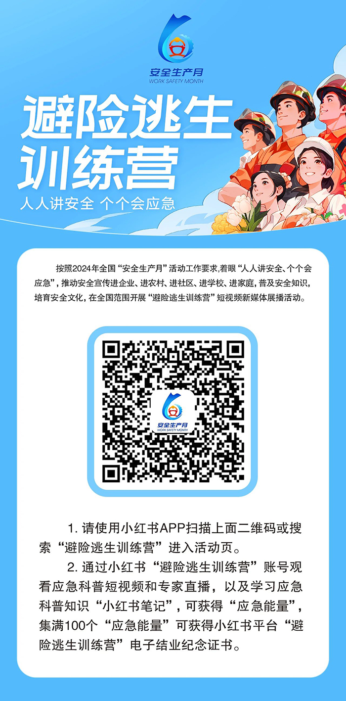 通过小红书“避险逃生训练营”账号观看应急科普短视频和专家直播,以及学习应急科普知识“小红书笔记”,可获得“应急能量”,集满100个“应急能量”可获得小红书平台“避险逃生训练营”电子结业纪念证书。