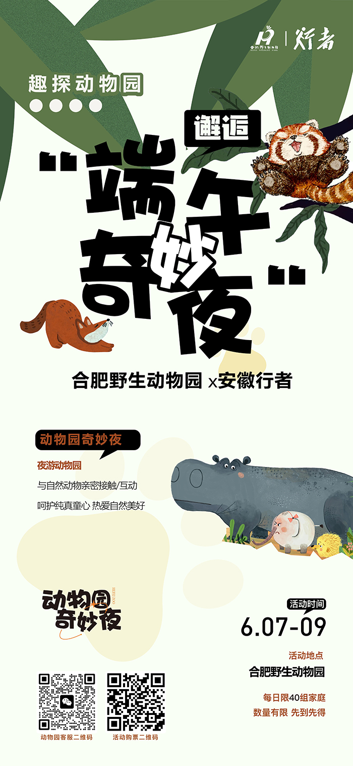 端午假期(6.7-6.9)开展动物园奇妙夜端午专场活动,有夜观+讲解+露营,听鸟鸣+狮吼+狼嚎,在民俗节日趣探动物园。(详情点击→动物园奇妙夜端午专场来啦)