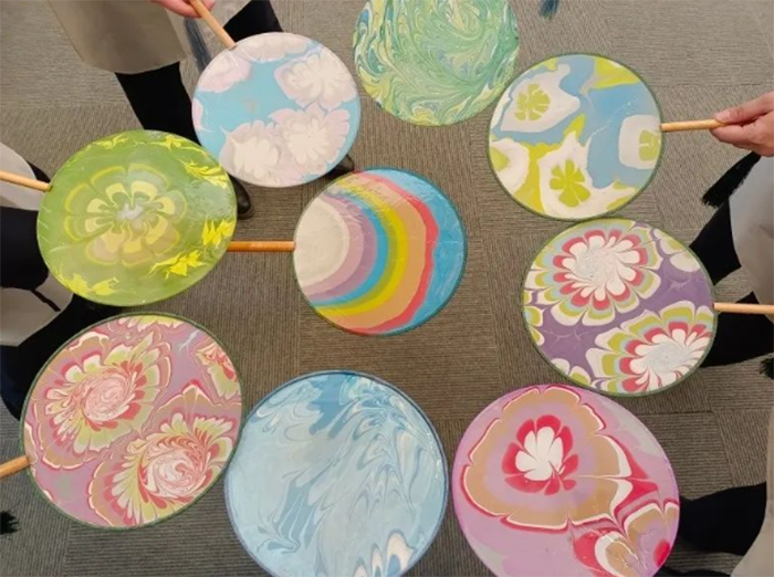以扇为纸,以水作画,自然造物,水拓画起源于唐宋的墨池画,是我国水墨画众多画法其中的一种画,每一次浸泡邂逅独一无二的花纹。