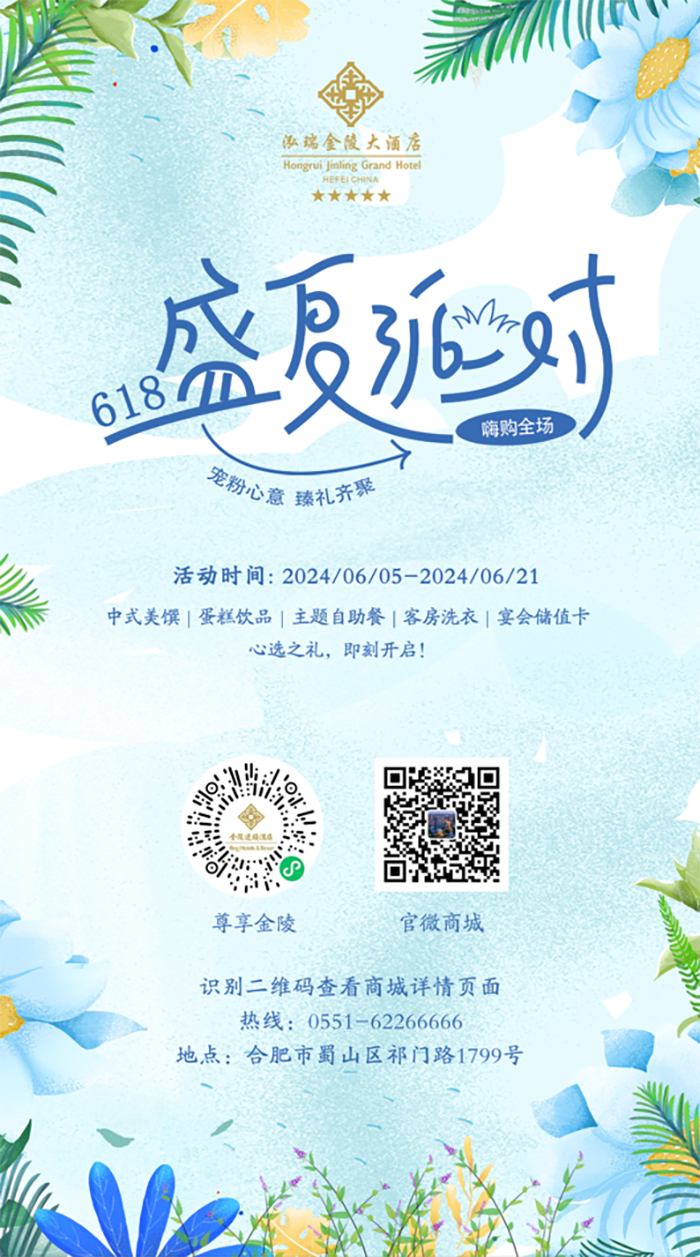 6月5日-6月21日期间,酒店开启“盛夏派对”,宠粉心愿、帧礼齐聚,嗨购全场。不仅有129元的金海湾成人豪华自助晚餐,更有端午系列、高考系列、升学毕业系列惊喜等着你。具体好礼可扫码查看商城详情页面。