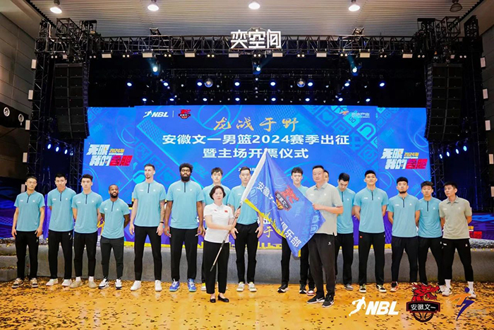 出征仪式现场,安徽省体育局球类运动管理中心党总支书记李燕代表省体育局向安徽文一授旗,主帅郑武代表球队郑重接旗。队长杨文博代表球员郑重宣誓:努力训练,顽强拼搏,团结协作,全力卫冕。2024赛季,安徽文一的目标依然是夺冠,成为NBL五冠王。