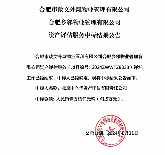 合肥市政文外滩物业管理有限公司合肥乡邻物业管理有限公司 资产评估服务中标结果公告