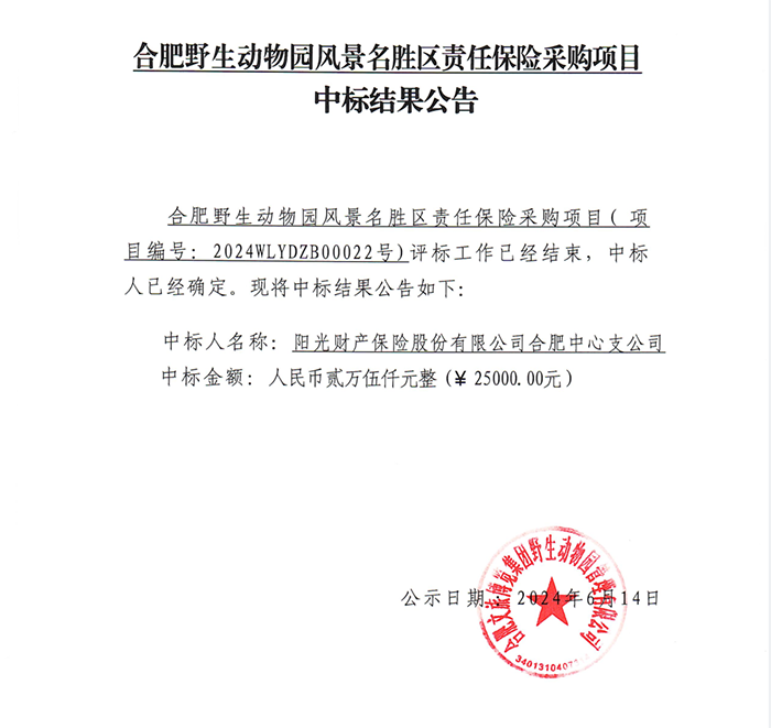 合肥野生动物园风景名胜区责任保险采购项目中标结果公告